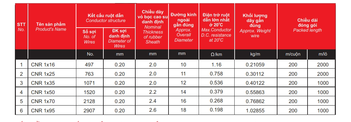 – Vật liệu cách điện và vỏ bọc: Cao su gốc tự nhiên.
