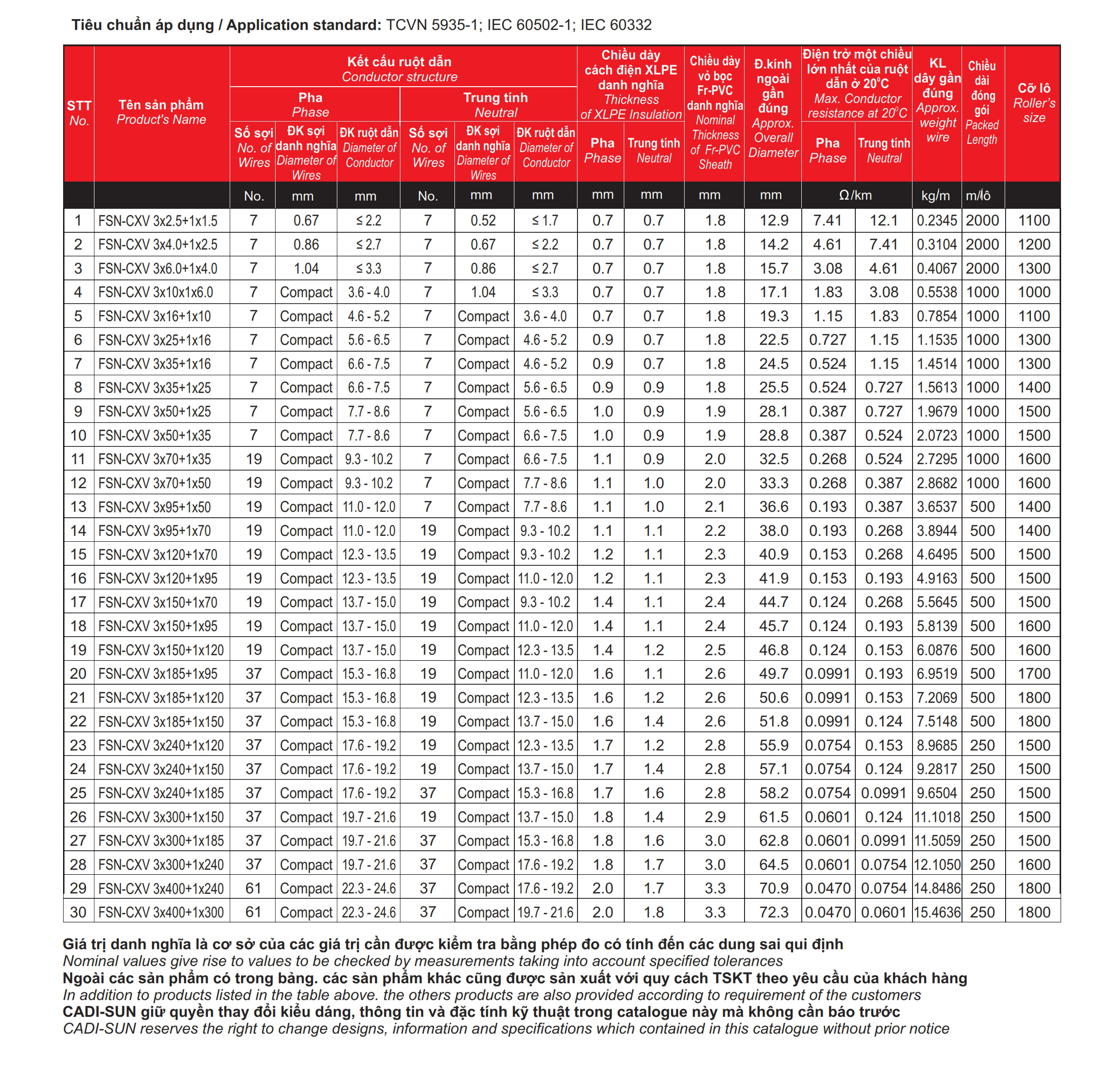 CÁP CHẬM CHÁY FSN-CXV 3X+1X -0.6/1 kV