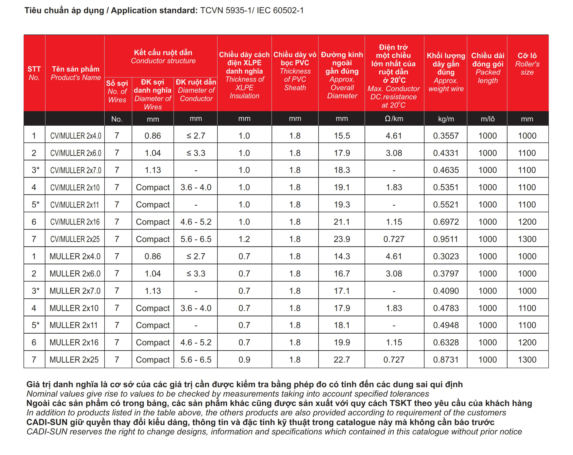 * Ghi chú: Ngoài các quy cách nêu trên, CADI-SUN có thể đáp ứng các yêu cầu khác của khách hàng.