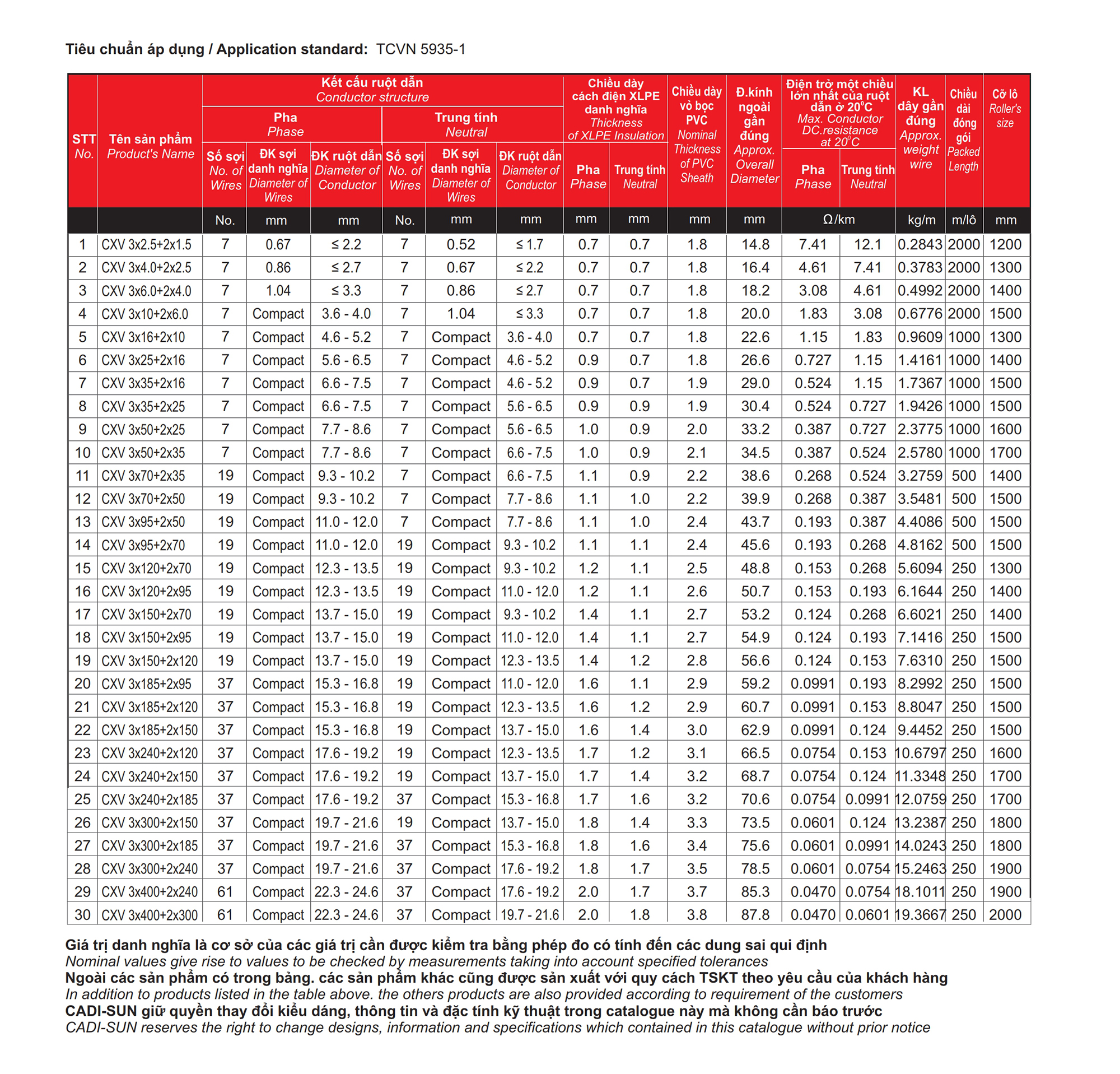 CÁP ĐỒNG 4 RUỘT, BỌC CÁCH ĐIỆN XLPE, VỎ BỌC PVC – CXV 3X+1X- CXV 3X+2X – 0.6/1 kV