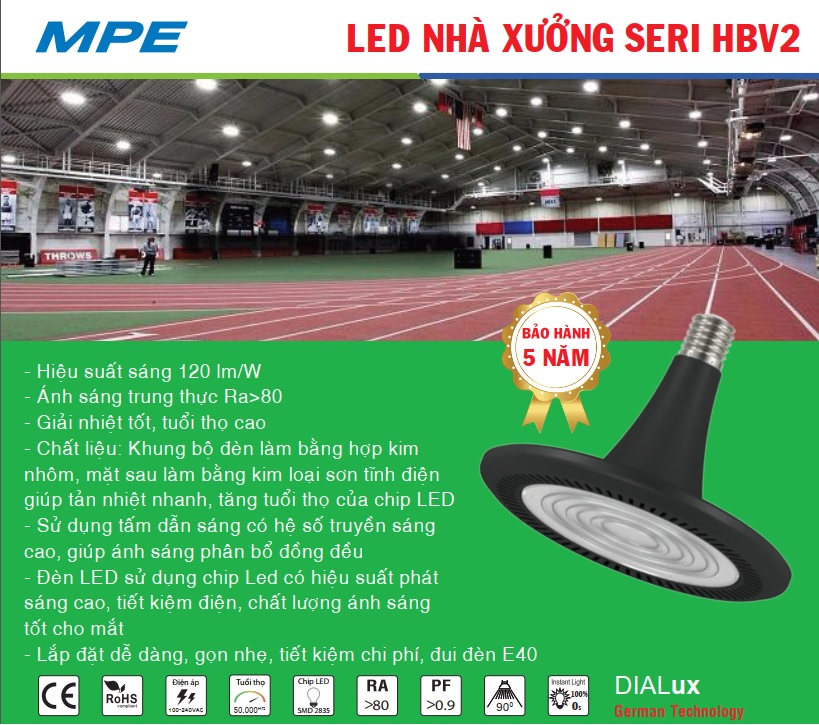 Đèn LED Highbay HBV2 có thiết kế gọn nhẹ, dễ dàng lắp đặt sử dụng cho nhà xưởng, kho bãi, dự án, công trình….