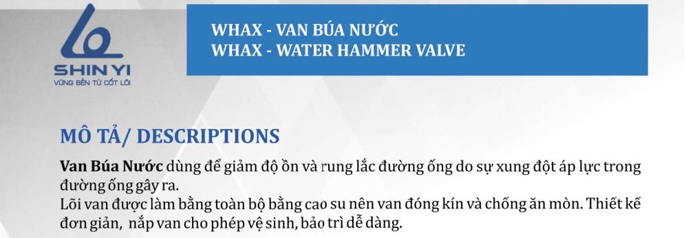 Van búa nước Shinyi (hay còn gọi van chống va, van chống nước va, van chống búa nước, van chống va đập,…) là loại van được điều khiển thủy lực kích hoạt bởi áp lực đường ống. Cấu tạo của van có 2 Pilot được áp dụng cho áp lực cao và thấp.